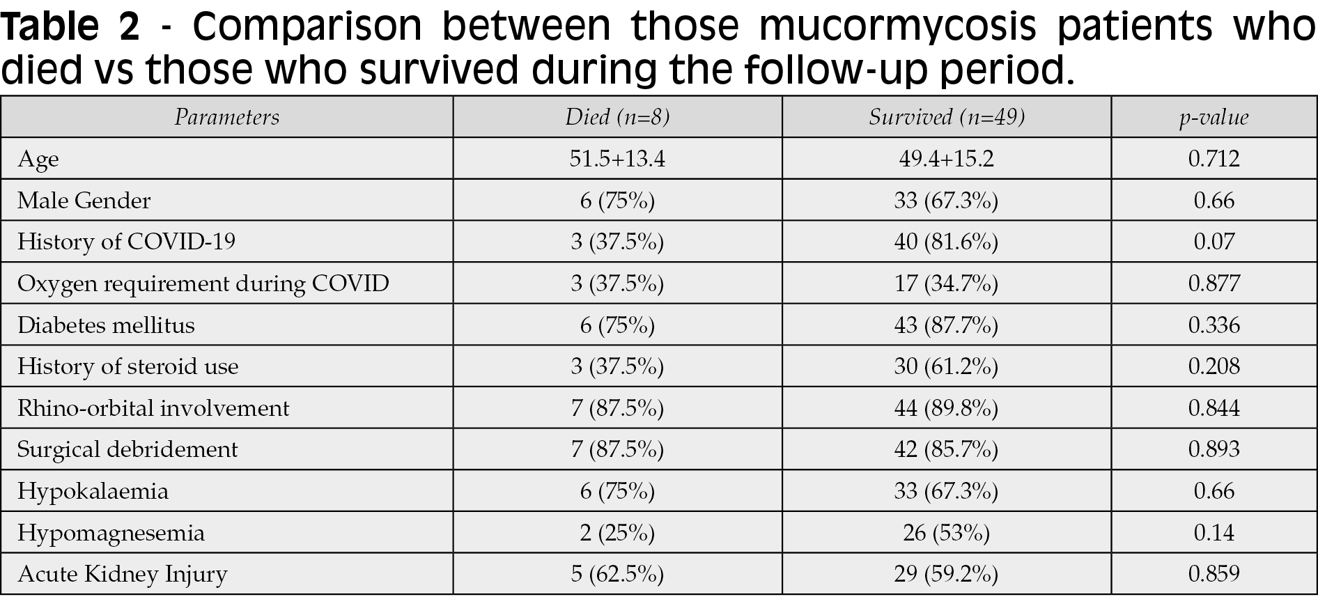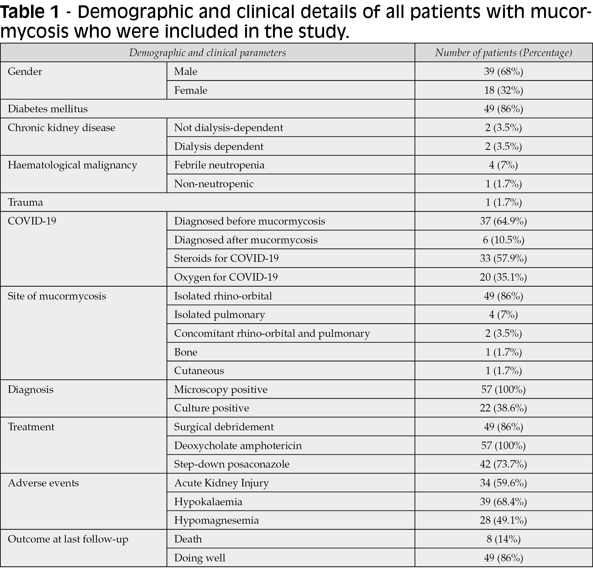 Results: Of the 57 included patients, a history of diabetes, COVID-19 and steroid use was present in 49 (86%), 43 (75.4%) and 33 (57.9%) patients, respectively. Isolated rhino-orbital mucormycosis was the most common presentation (n=49, 86%). The median time of follow-up was 48 (30.5-90) days. A total of 8 (14%) patients died during the hospital stay. The median duration of amphotericin treatment was 21 (14-40) days. Thirty-nine patients (68.4%) developed hypokalaemia on treatment, while 27 (47.4%) patients developed hypomagnesaemia. A total of 34 (59.6%) patients developed AKI on treatment. The median day of development of AKI was 6 (4-10) days. The median baseline, highest and final creatinine values were 0.78 (0.59-0.94) mg/dl, 1.27 (0.89-2.16) mg/dl and 0.93 (0.74-1.59) mg/dl respectively. The median percentage change from baseline to highest value and last follow-up value was 45% (0.43%-161%) and 25% (-4.8%-90.1%) respectively. The final creatinine was less than 150% of the baseline in 36 (63.2%) patients.