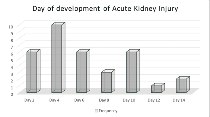 Figure 1 - Number of patients with Acute Kidney Injury on amphotericin and the day of development.