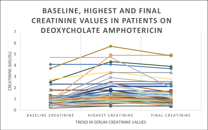 Methodology: This retrospective cohort study from 2019 to 2021 included patients with proven mucormycosis who received deoxycholate amphotericin B for more than or equal to five days and had at least three creatinine values on treatment. Baseline demographic details, risk factors and treatment details of all the patients were recorded. In addition, the details of treatment-related adverse effects and outcomes were ascertained.