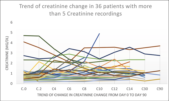 Figure 3 - Trend of creatinine change in those patients with more than five creatinine recordings (n=36).
