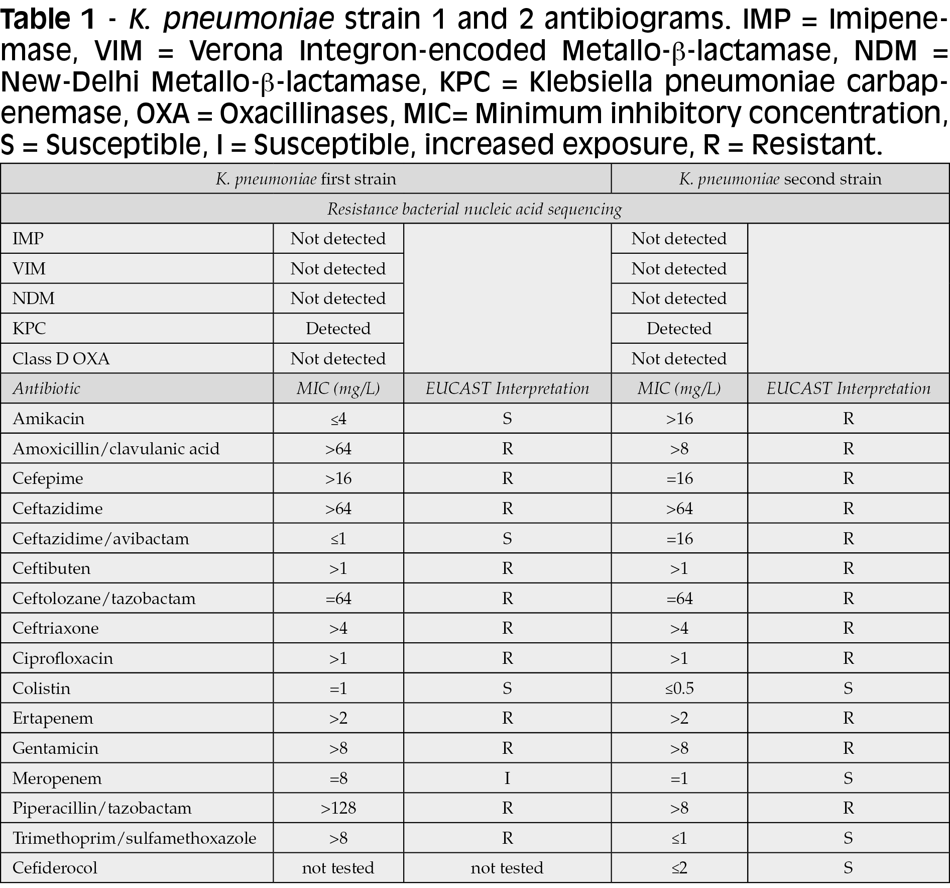 After three days, a CPKP (Table 1) was identified in CSF culture. Antibiotics susceptibility tests were performed using broth microdilution. Clinical breakpoint and susceptibility interpretations were based on EUCAST Jan 1, 2022 criteria. Carbapenem resistance was identified with real-time PCR Cepheid Genexpert®. Blood culture was negative.