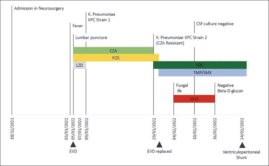 According to these results, CZA was stopped, and FDC was prescribed at the dosage of 2 g every 6 hours, with an extended infusion of 3 hours. FOS was continued for a few days and then substituted with trimethoprim/sulfamethoxazole (TMP/SMX) at the dosage of 320/1600 mg (15 mg/kg of trimethoprim) every 6 hours. Finally, EVD was replaced.