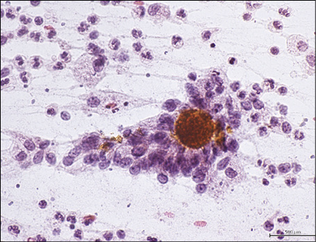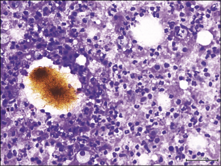 Figure 3 - Fine-needle aspiration cytology of lymph nodal actinomycosis showing filamentous colonies of bacteria with a yellowish color and the typical feature of “sulfur granules” consistent with the Splendore-Hoeppli phenomenon (Diff-Quik stain, 270X).