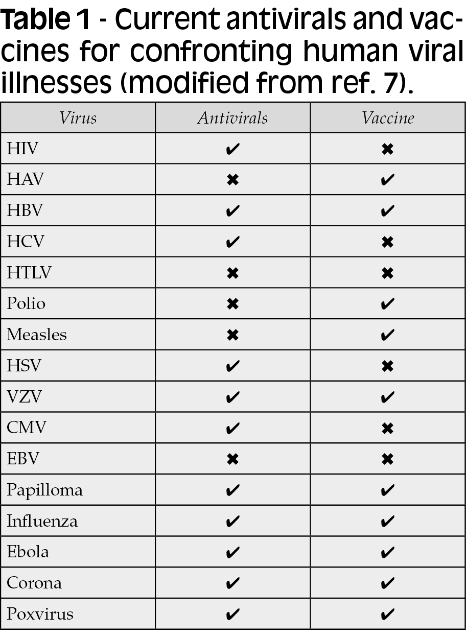 The battle against human viral infections has historically relied on two medical strategies, namely vaccines to protect from contagion and antivirals to treat infected patients. For different reasons, the development of effective vaccines and/or antivirals has been achieved for some but not all viruses (Table 1). Vaccines use immunogens that awake specific adaptive humoral and/or cellular immune responses in the host, preventing the acquisition of a given infectious agent. In contrast, antiviral drugs target either unique viral proteins or cellular molecules that are critical for viral replication. Antivirals that exclusively target viral enzymes benefit from having no expected effects on human proteins, and therefore less chances to produce adverse events [2].