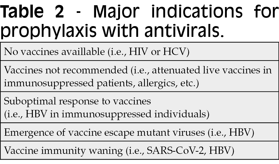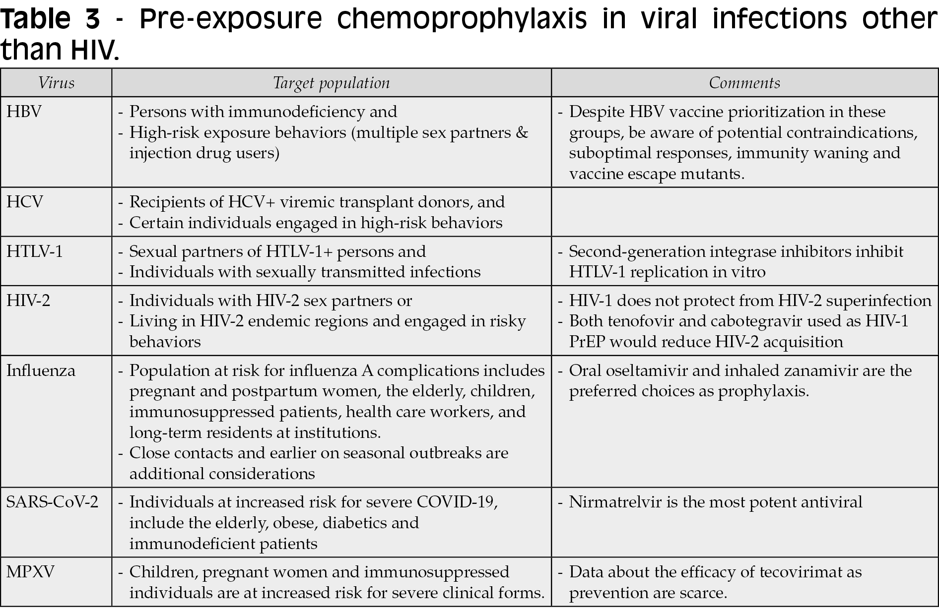 The HIV field has been upfront in this new medical paradigm proving the efficacy of antiretrovirals as PrEP. The advent of long-acting antiretroviral formulations to be used as PrEP has proven very effective using intramuscular or subcutaneous injections just once or a few times yearly. Are we ready to consider a similar approach confronting other common human viral infections? [60-62]. We have identified distinct patient populations and specific clinical settings in which there is room for considering chemoprophylaxis for viral hepatitis B or C, retroviruses HTLV-1 or HIV-2, or respiratory viruses such as influenza or SARS-CoV-2.