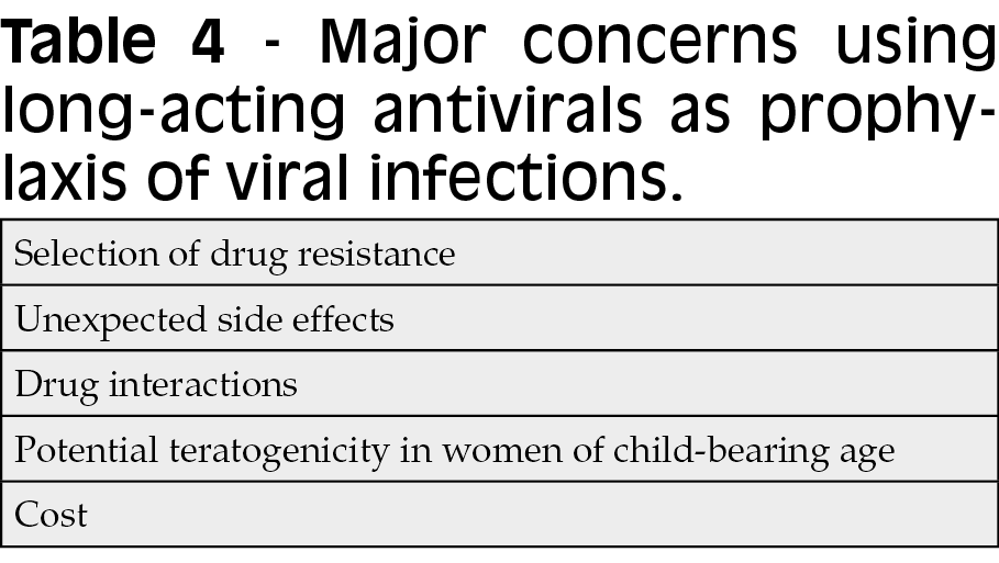 The use of antivirals as prevention rather than treatment of viral infections is steadily gaining support to prevent serious illnesses. Mimicking the protective effect of vaccines, PrEP with antivirals will reduce the chances of acquiring potentially life-threatening infections. The advent of long-acting formulations may further encourage PrEP use with antivirals for infections other than HIV-1. However, enthusiasm unabated, several concerns require attention (Table 4). There are at least four major considerations.