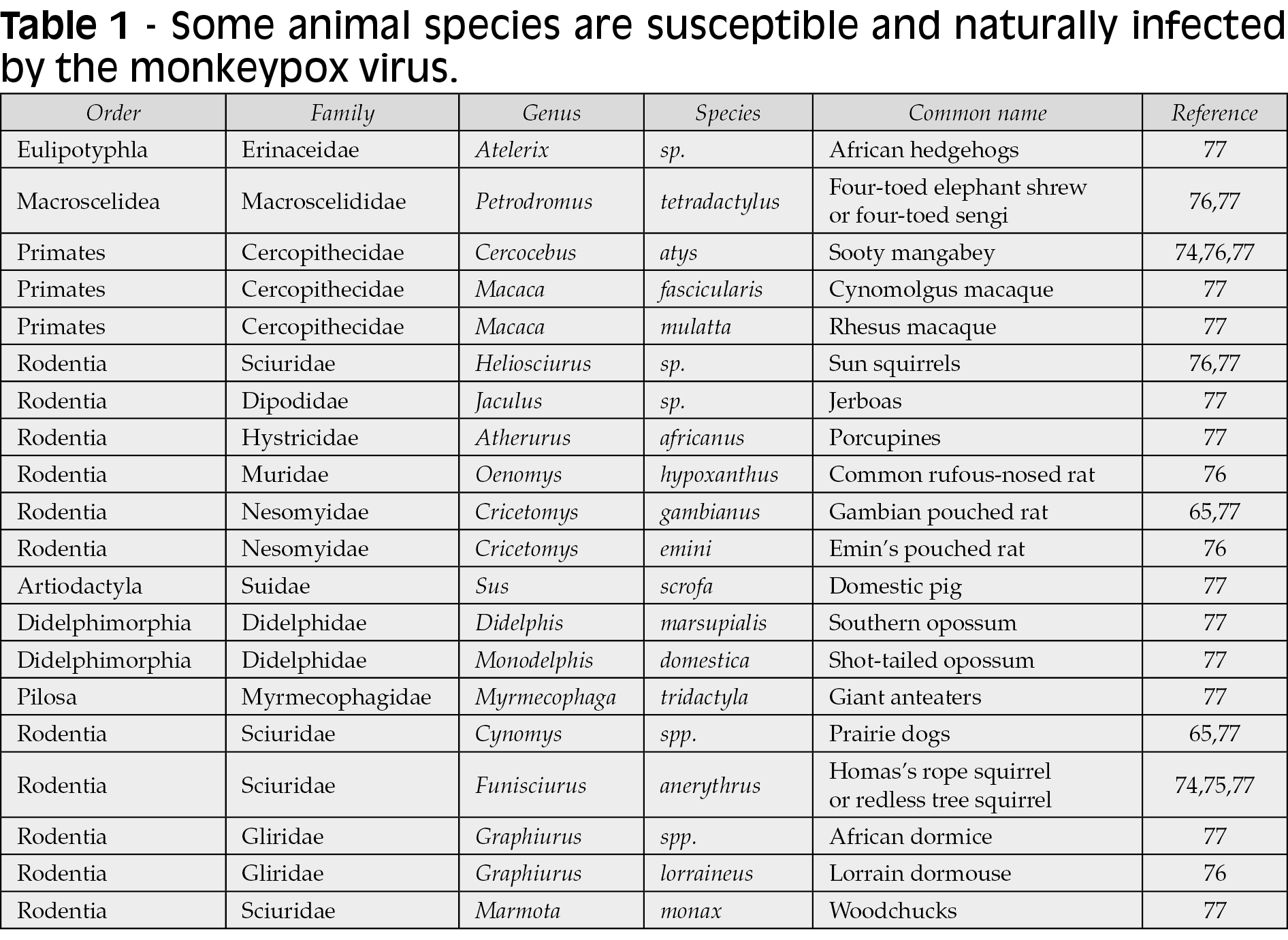 [76] Doty JB, Malekani JM, Kalemba LN, et al. Assessing Monkeypox virus prevalence in small mammals at the human-animal interface in the Democratic Republic of the Congo. Viruses. 2017; 9 (10), 283.