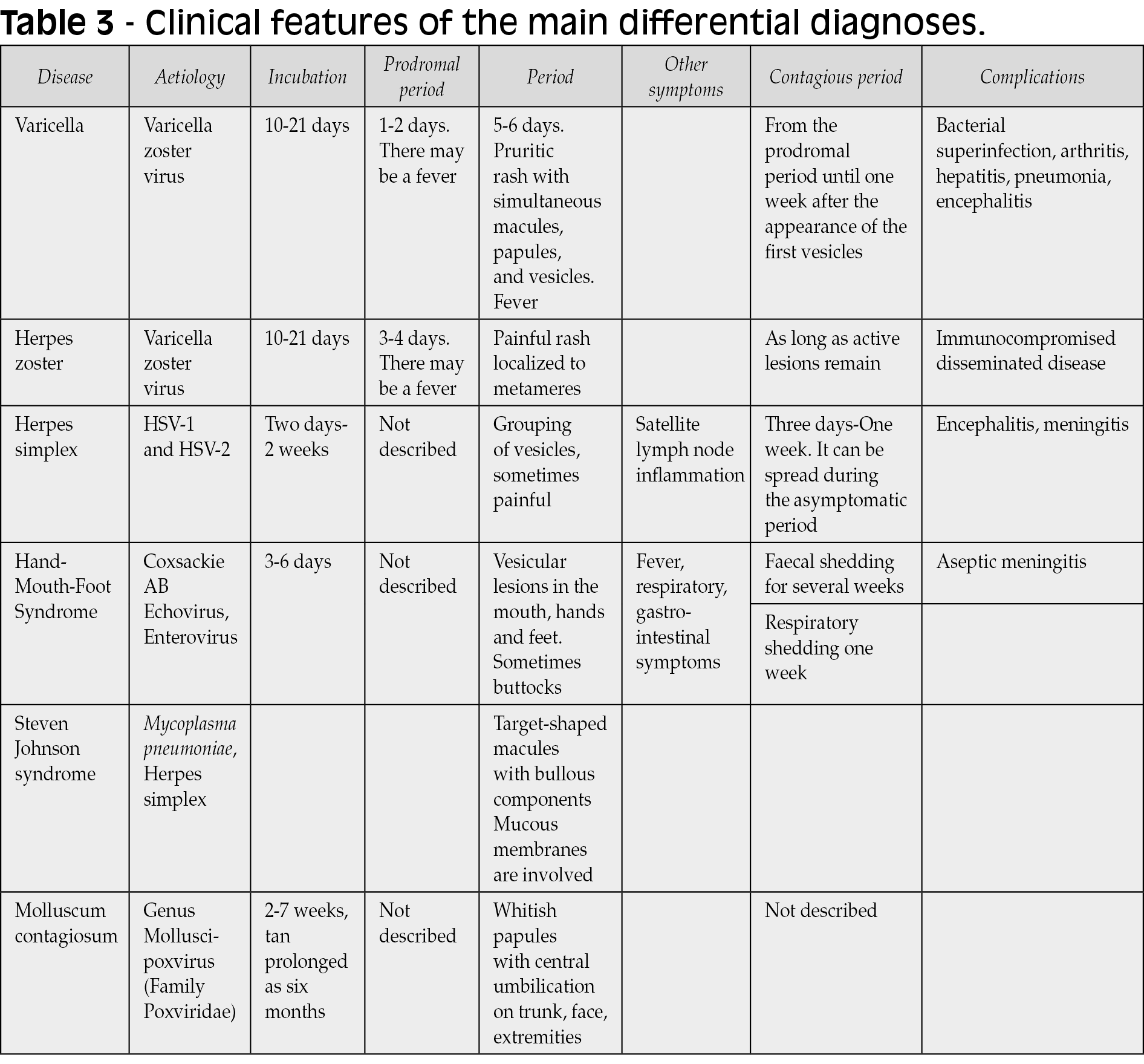 Figure 7 - Clinical differential diagnosis of monkeypox; Varicella (panels A and B), Herpes simplex, disseminated (panel C) and herpetic gingivostomatitis (panel D), foot-and-mouth disease due to Coxsackievirus (panels E, F, G and H), secondary syphilis (panels I, J and K), scabies (panel L), measles (panels M, N, and O), metameric Herpes zoster (panel P), and Stevens-Johnson syndrome (panel Q) (Photos took by Dr. J.A. Suárez, with consent).
