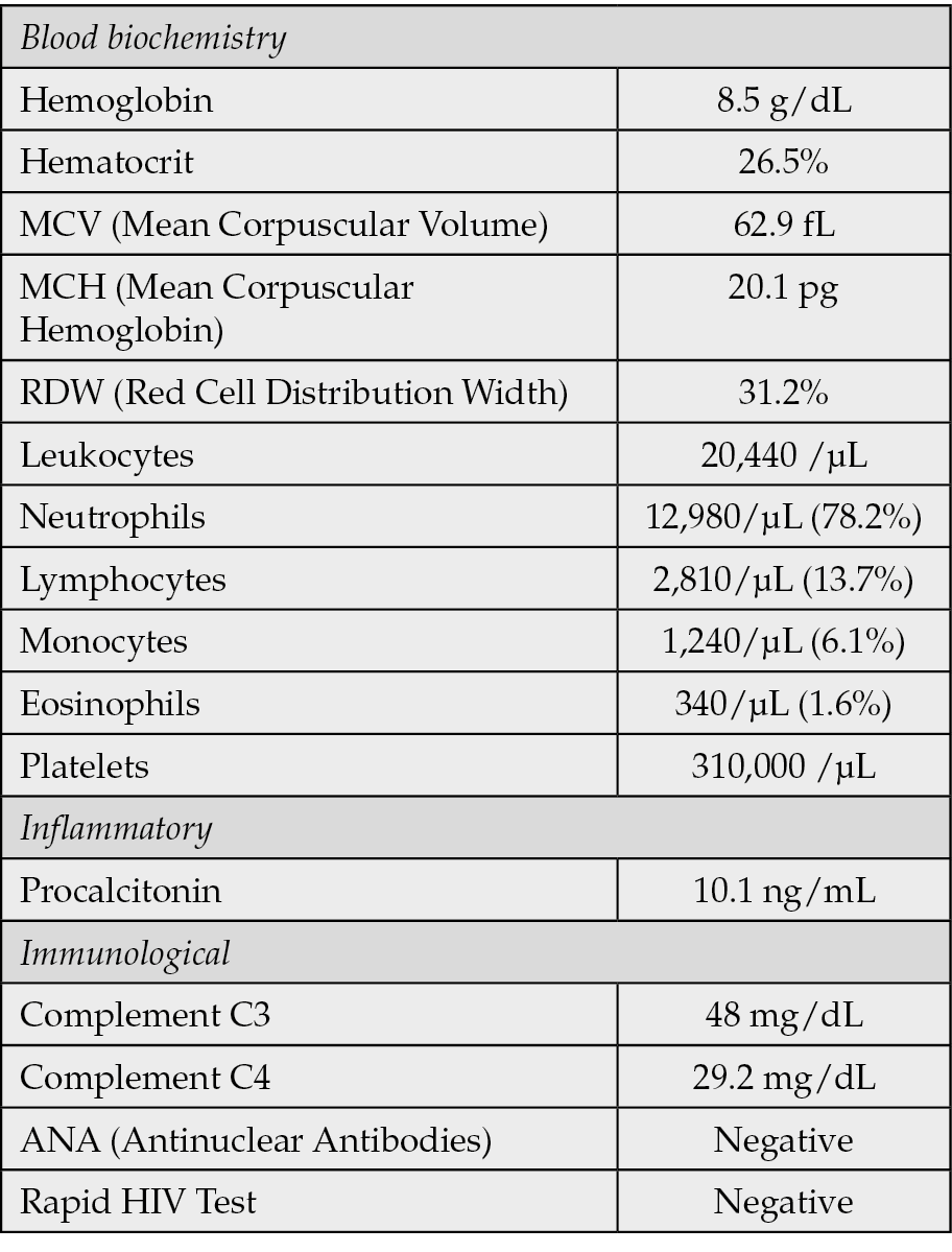 At the referring center, a myeloproliferative syndrome had initially been suspected based on an abdominal CT scan that showed mesenteric lymphadenopathy with reactive features and hypochromic microcytic anemia. Initial laboratory results (Table 1) revealed leukocytosis with a left shift, elevated procalcitonin levels, and features consistent with a systemic inflammatory response. Empirical antibiotic therapy was started, but the patient remained hypotensive despite intravenous fluid resuscitation, requiring vasopressor support and subsequent admission to the intensive care unit due to distributive shock.