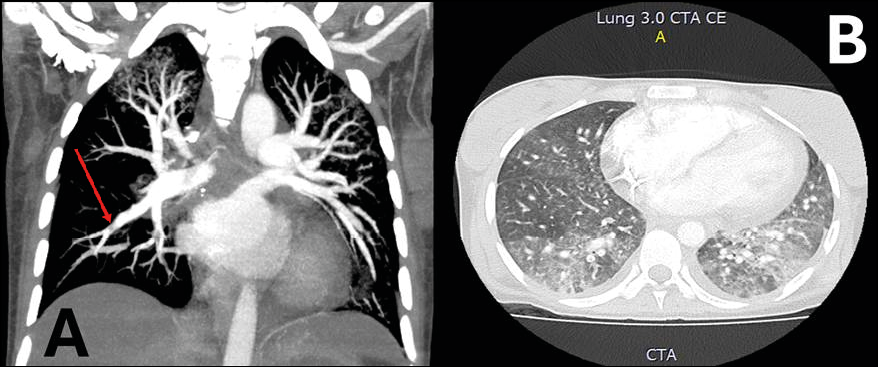 Figure 1 - Pulmonary Angiotomography: Coronal (A) and Axial (B) images. A. Central filling defect in the branches of the basal segment of the right lower lobe, with signs of a “lane” indicative of pulmonary thromboembolism. B. Interstitial involvement in medial areas with a ground-glass appearance.