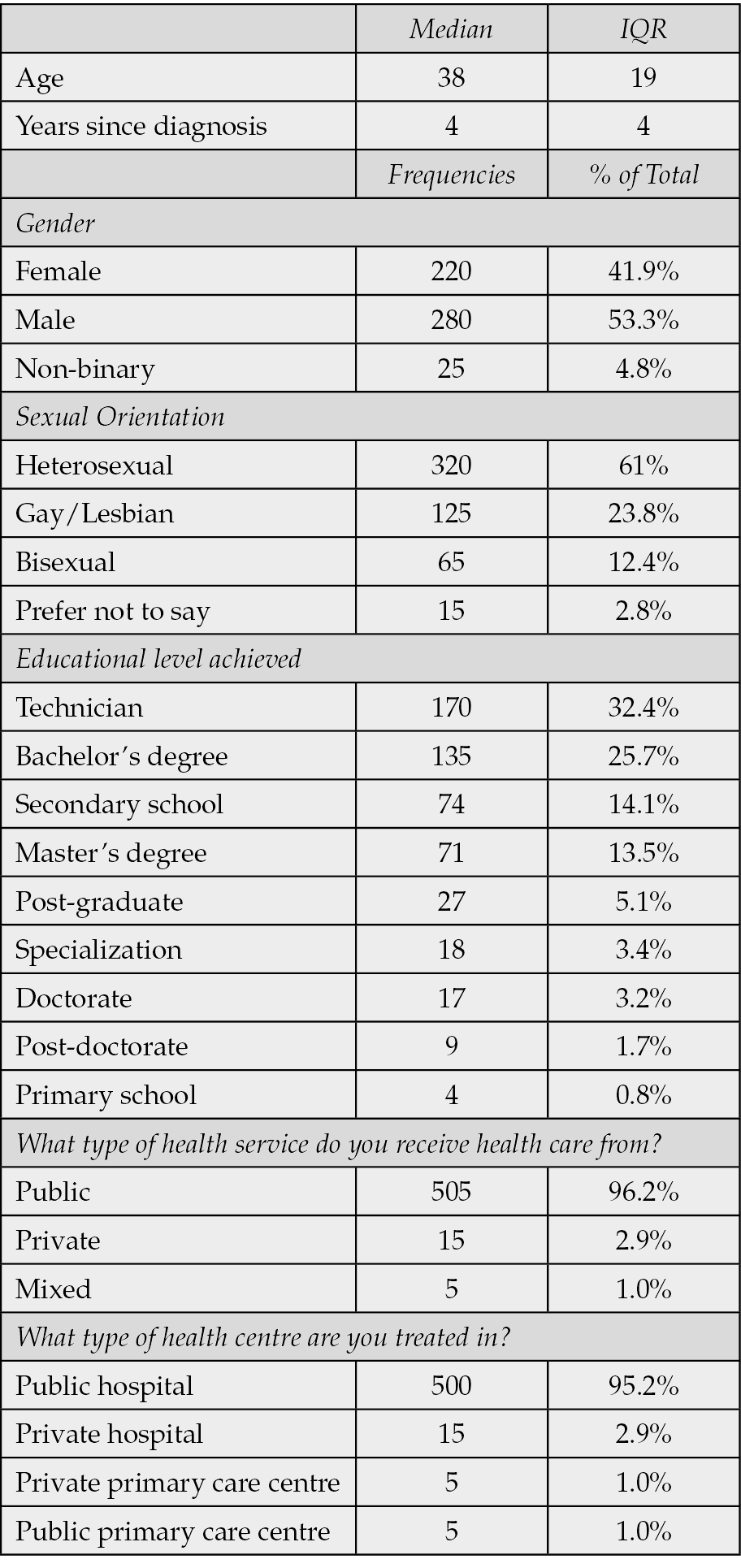 Results: The study included 525 participants, mostly men (53.3%), with a median age of 38 years and an average of four years since diagnosis. The majority (96.2%) received care through the public healthcare system.
