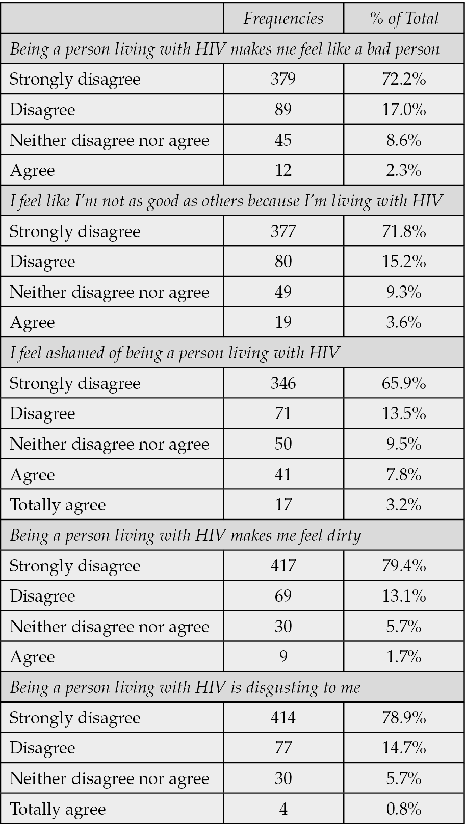 The majority of participants rejected stigmatising ideas associated with living with HIV. A total of 72.2% strongly disagreed that their diagnosis made them feel like a bad person, and 71.8% rejected the idea of not being as good as others.