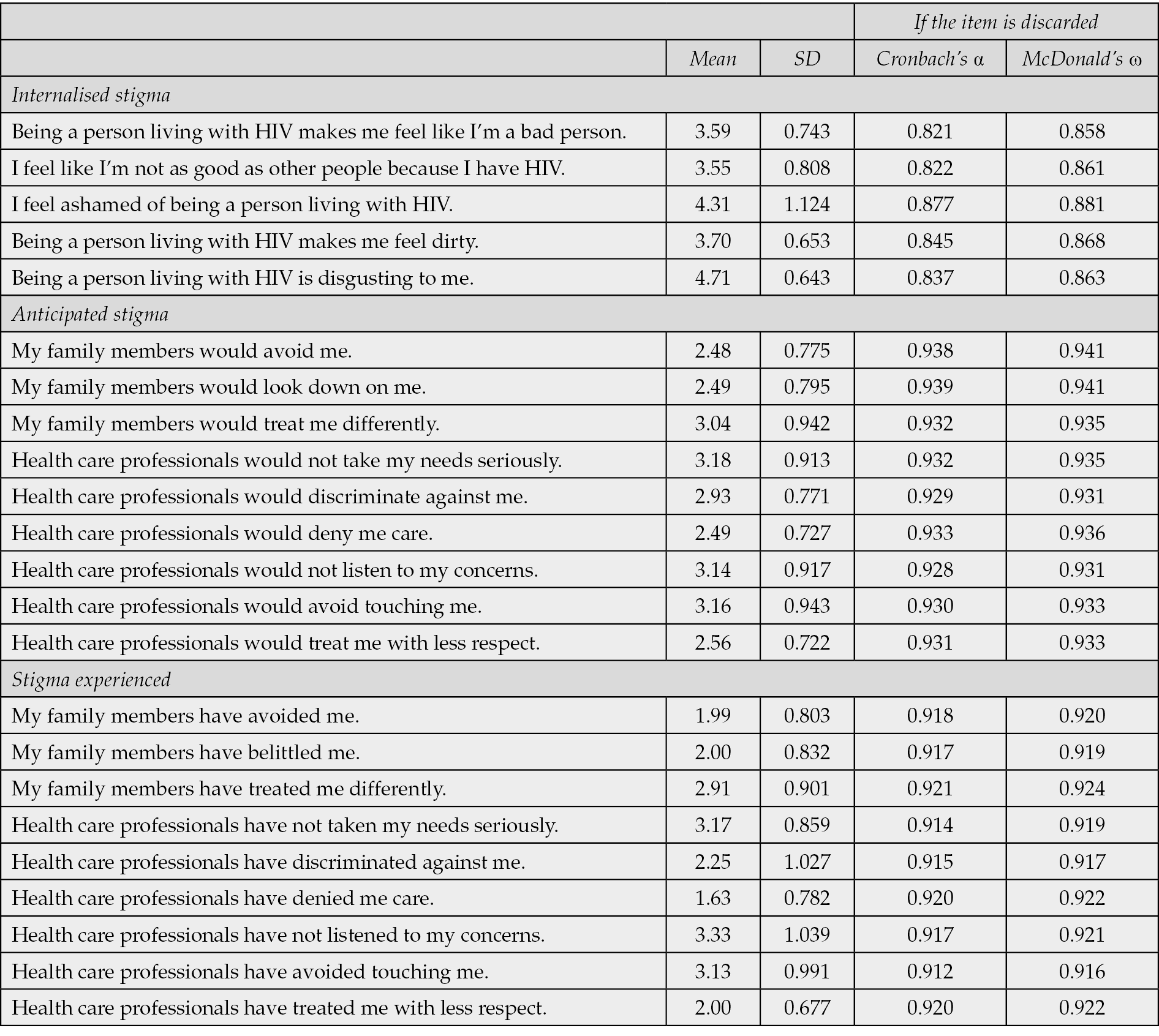 Table 5 - Reliability analysis and descriptive statistics of the items of the questionnaire on stigma in PLWH.