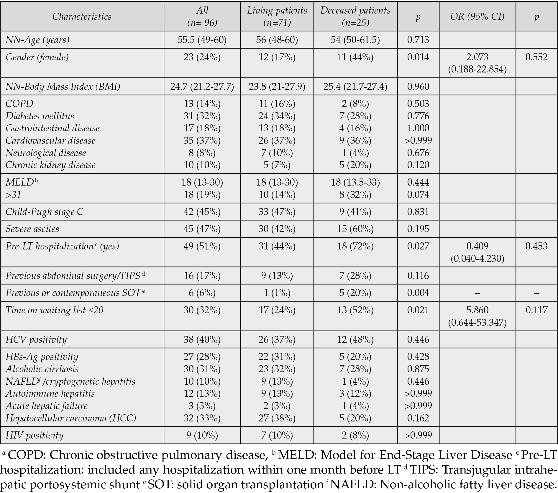 A significantly higher proportion of female LT recipients died within one month after BSI (p=0.014); higher mortality was observed in patients with a waiting list time of less than 20 days (p=0.021). Additionally, hospitalization in the month before LT was more common among patients with negative outcomes (p=0.027) as they more frequently underwent combined kidney-liver transplantation or liver retransplantation (p=0.004).