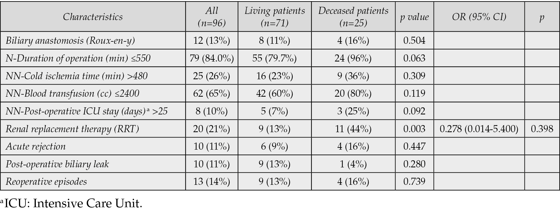 Regarding chronic comorbidities, there were no significant differences between the two groups. However, the need for renal replacement therapy (including hemo- or peritoneal dialysis, haemo (dia)filtration and plasmapheresis) in the perioperative periods was significantly associated with higher mortality (p=0.003).