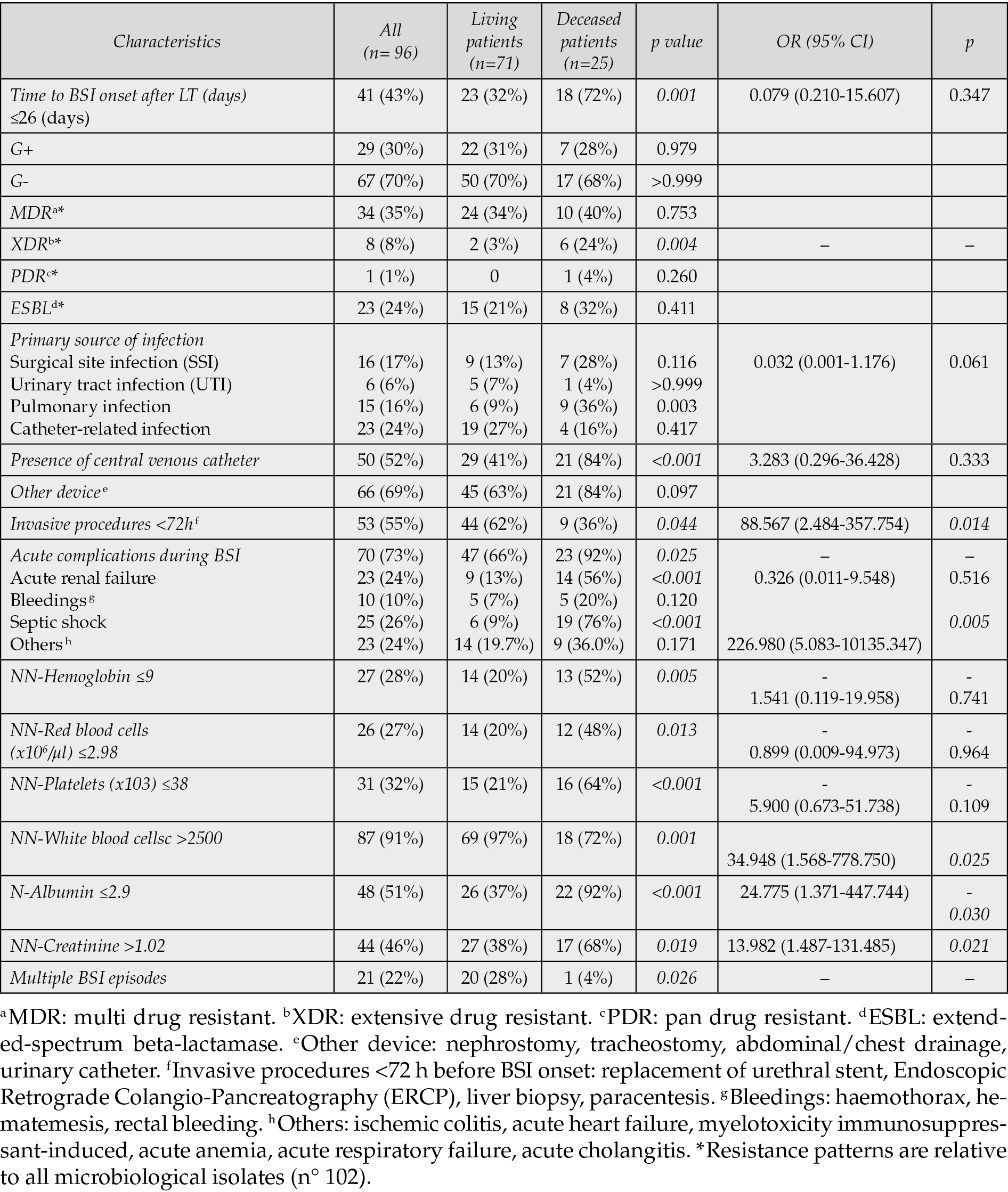 An earlier BSI onset (≤ 26 days from LT), the presence of intravascular central catheter, the occurrence of acute renal failure and septic shock were all significantly associated with higher mortality (p ranging from <0.001 to 0.044). Undergoing invasive procedures before 72 hours of BSI onset was a protective factor (p 0.044). Furthermore, a significantly larger percentage of deceased versus living LT recipients presented pneumonia as the primary source of infection (36% vs 9 %, p=0.003) and were infected with an XDR strain (24% vs 3%, p=0.004).