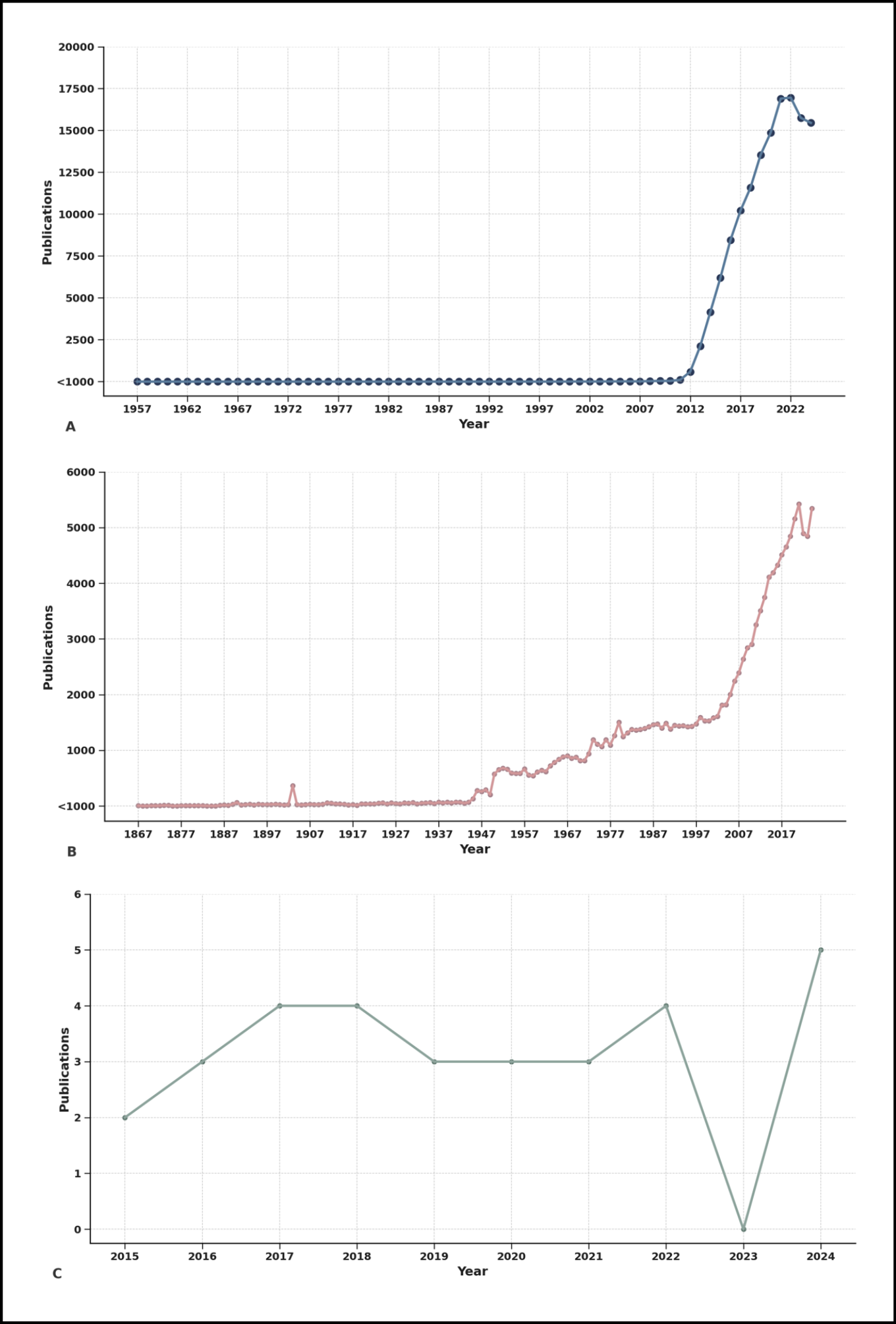 This figure illustrates the temporal evolution in the volume of scientific publications from Scopus databases. Panel A shows the exponential rise in publications related to Big Data, especially after 2010, reflecting its widespread global adoption. Panel B presents the historical trajectory of publications on NTDs, evidencing steady but less prominent growth, particularly since the early 2000s. In stark contrast, panel C highlights the limited number of publications that integrate both Big Data and NTDs, with fewer than six publications per year and an almost negligible presence before 2015. These disparities underline a critical research gap and the missed opportunity to harness data-intensive technologies for diseases that disproportionately affect the world’s poorest populations.