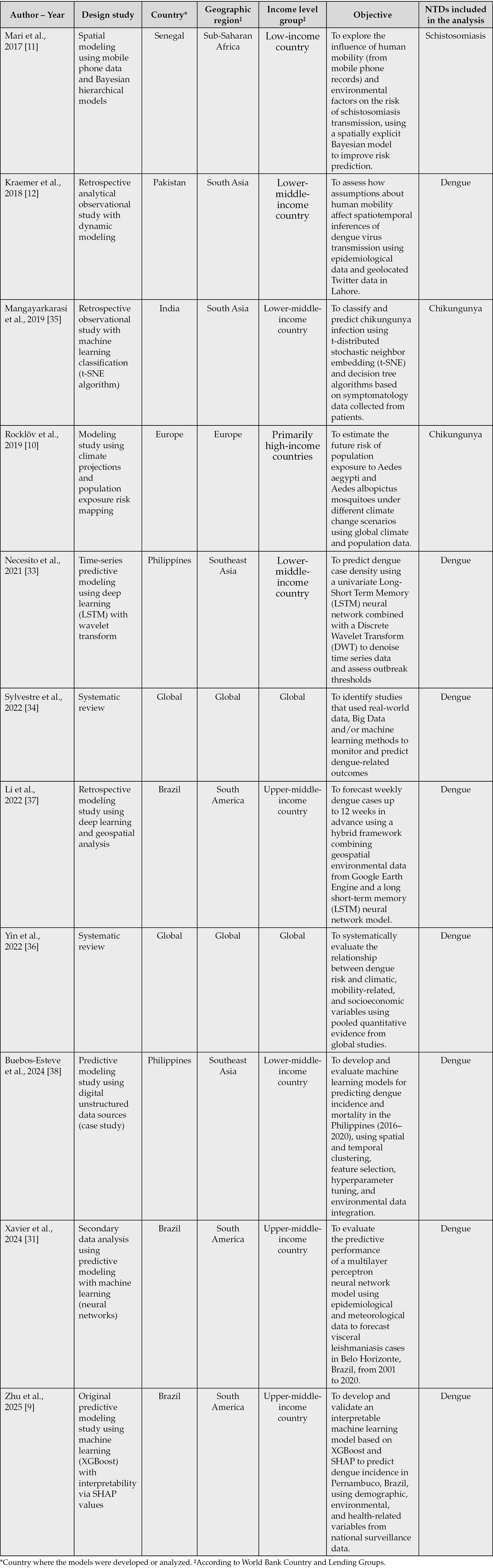 Table 1 - Summary of original studies and systematic reviews using big data for NTDs research.