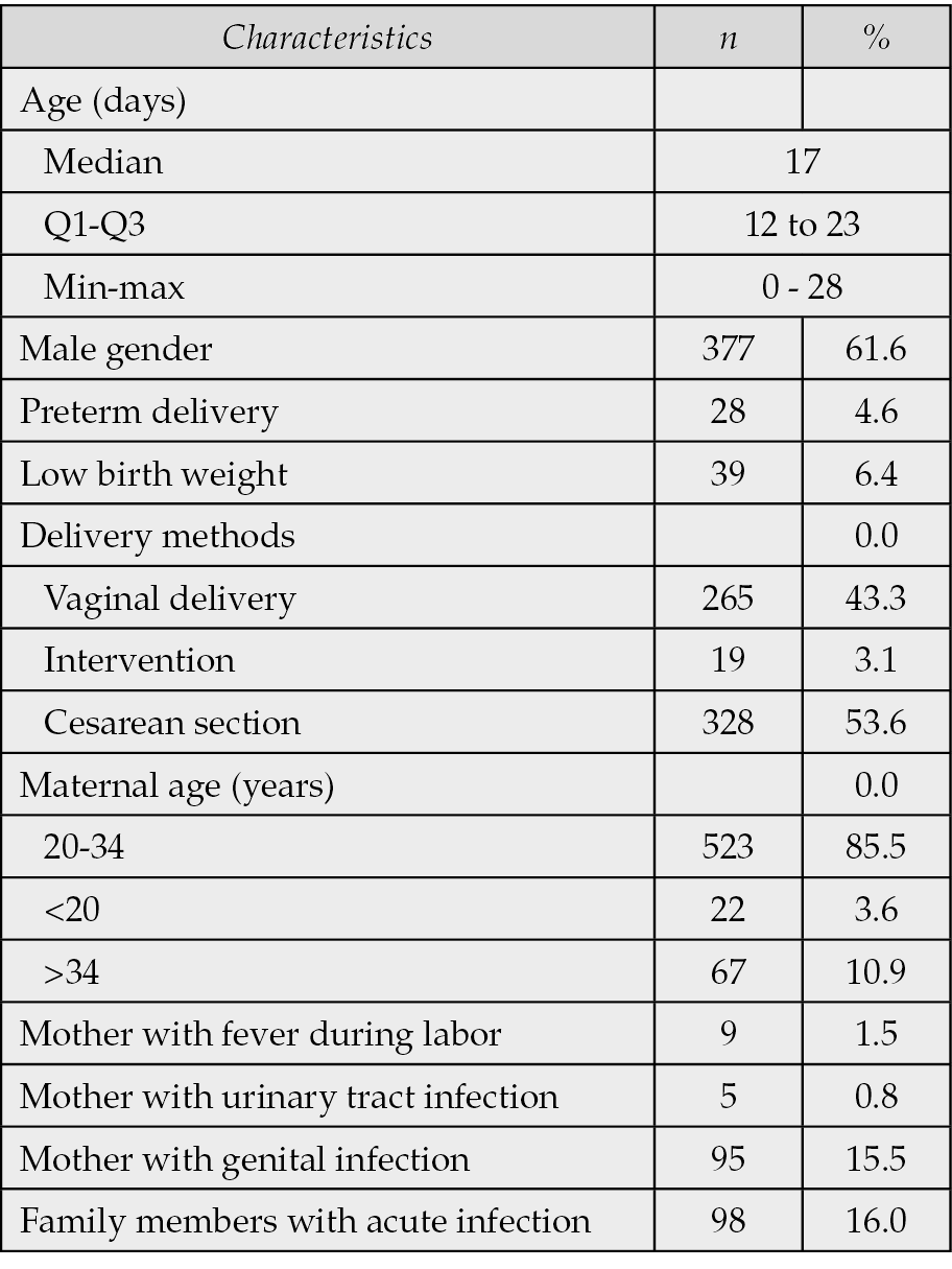 Over a one-year period, the study included 612 patients with pneumonia out of 1034 hospitalized neonates, hence the prevalence of neonatal pneumonia was 59.2%. The median age at admission was 17 days (IQR: 12–23) and 61.6% were male. Preterm delivery occurred in 4.6% of cases, and 6.4% of infants had low birth weight. Most deliveries were by cesarean section (53.6%), and the majority of mothers were aged 20–34 years (85.5%). Maternal genital infections and family members with acute infections were reported in 15.5% and 16.0% of cases, respectively (Table 1).