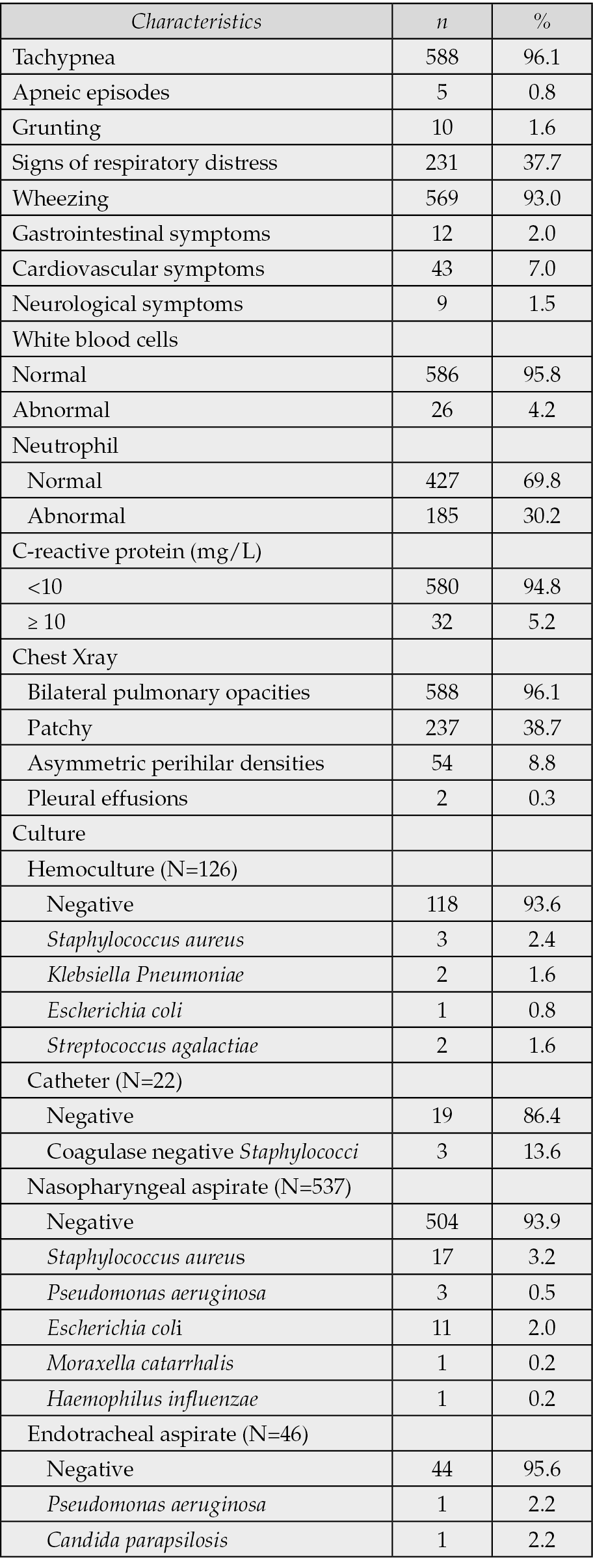Results: Of 1,034 admissions, 612 (59.2%) met pneumonia criteria; mortality rate was 0.2%. Median age at admission was 17 days (IQR 12–23), and 61.6 % were boys. Preterm birth and low birth weight occurred in 4.6% and 6.4% of cases, respectively. Tachypnoea (96.1%), wheeze (93.0%), and signs of respiratory distress (37.7%) were predominant. Abnormal neutrophil counts were observed in 30.2%, and 5.2% had C-reactive protein (CRP) ≥10 mg/L. Independent risk factors for IMV were younger age (adjusted odds ratio [aOR] 0.88 per day; 95% CI 0.85–0.92), neurological symptoms (aOR 24.0; 95% CI 4.07–141.67), and CRP ≥10 mg/L (aOR 3.23; 95% CI 1.22–8.52).