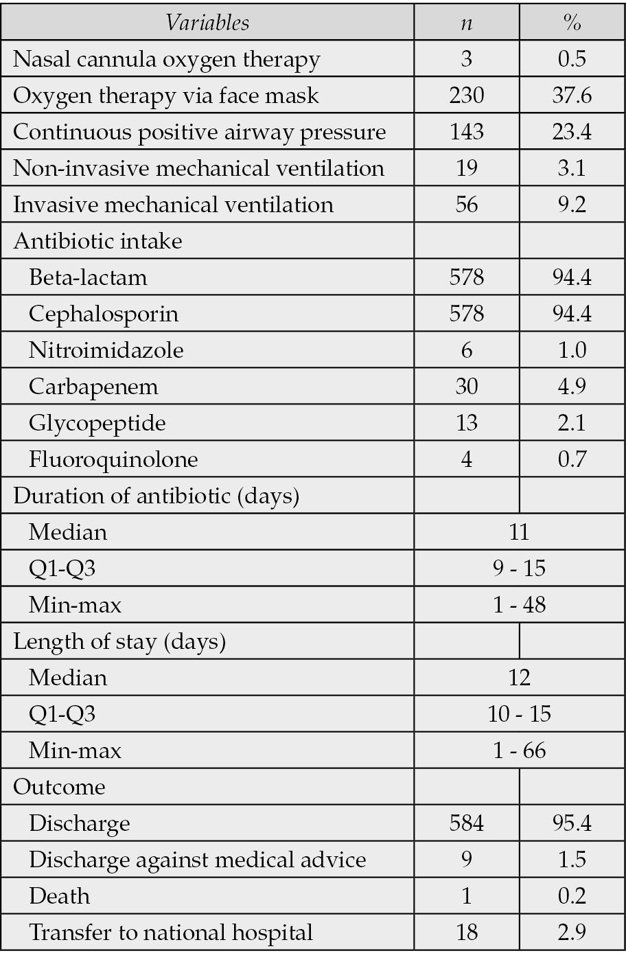 Regarding treatment modalities, 9.2% of patients required invasive mechanical ventilation (IMV), and 3.1% received non-invasive ventilation. Antibiotics were administered in all patients, with 94.4% of patients receiving beta-lactams and cephalosporins as empirical therapy. The median duration of antibiotic therapy was 11 days (IQR: 9–15), and the median hospital stay was 12 days (IQR: 10–15). The majority of patients were discharged (95.4%), with only one death (0.2%) recorded (Table 3).