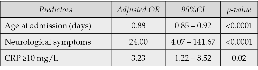 In the univariable analysis, younger age at admission (OR: 0.87; 95% CI: 0.84–0.91; p<0.0001), preterm delivery (OR: 2.92; 95% CI: 1.13–7.52; p=0.03), abnormal neutrophil count (OR: 2.16; 95% CI: 1.24–3.77; p=0.007), CRP ≥10 mg/L (OR: 3.69; 95% CI: 1.57–8.67; p=0.003), cardiovascular symptoms (OR: 3.44; 95% CI: 1.60–7.43; p=0.002), and neurological symptoms (OR: 39.57; 95% CI: 8.00–195.68; p<0.0001) were significantly associated with increased odds of requiring IMV (Table 4). In the multivariable logistic regression model, three variables remained independently associated with IMV: age at admission (aOR: 0.88; 95% CI: 0.85–0.92; p<0.0001), presence of neurological symptoms (aOR: 24.00; 95% CI: 4.07–141.67; p<0.0001), and CRP ≥10 mg/L (aOR: 3.23; 95% CI: 1.22–8.52; p=0.02) (Table 5).