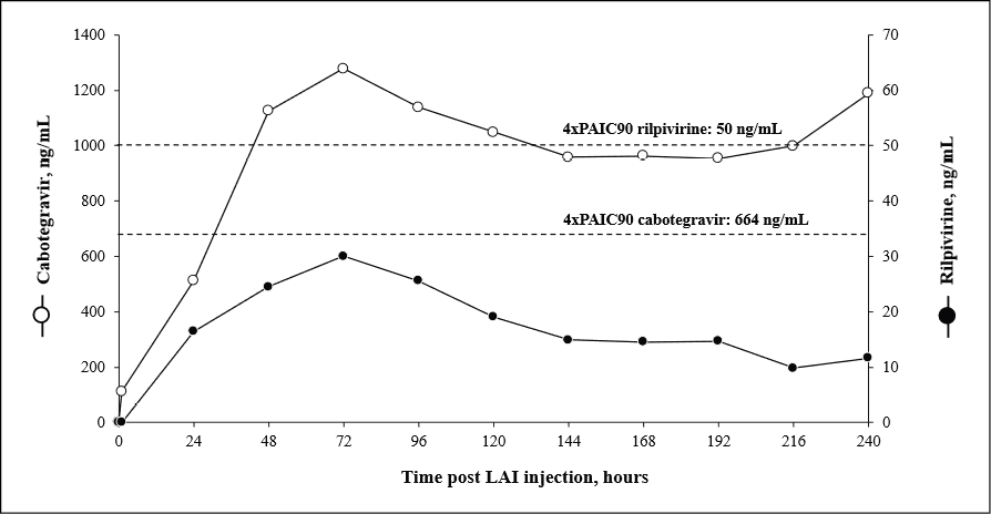Figure 1 - Time-course of cabotegravir and rilpivirine plasma concentrations measured in the first 10 days after intramuscular deltoid injection. Dotted lines represented the 4xPA-IC90 (664 ng/mL for cabotegravir and 50 ng/mL for rilpivirine).